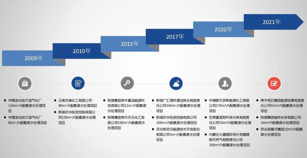 天津市創(chuàng)舉科技股份有限公司從2009年為中煤龍化哈爾濱氣化廠—130m³/h酚氨廢水預(yù)處理工段,成功改造脫酸脫氨塔后,正式步入酚氨廢水預(yù)處理領(lǐng)域的研究與開發(fā)行列中。由此開始,創(chuàng)舉公司先后參與了國(guó)內(nèi)諸多大型煤化工酚氨廢水預(yù)處理的項(xiàng)目建設(shè),截止到2022年,已為20余家企業(yè)提供了上百臺(tái)設(shè)備及核心內(nèi)件。